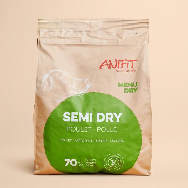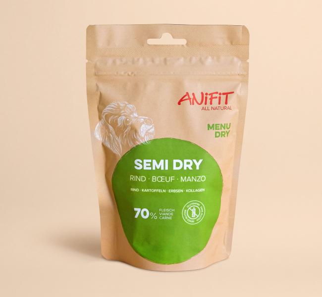ANiFiT ha due tipi di cibo per cani semi-umido nella sua gamma: Semi Dry pollo e Semi Dry manzo. Sono alimenti completi di alta qualità, con il 100% di carne fresca di pollo svizzero o di manzo svizzero, prodotti in Svizzera. Entrambi questi alimenti semiumidi sono fatti con cura e vanno bene per cani di tutte le razze e taglie. Grazie agli ingredienti di prima qualità e alla loro lavorazione, sono alimenti completi con una tollerabilità perfetta e un'accettabilità altissima.