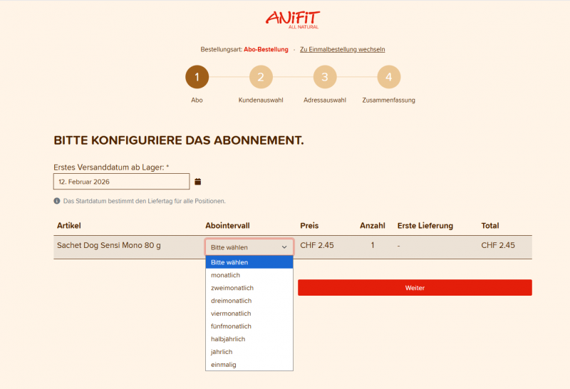 Bestimme anschliessend das erste Versanddatum und wähle aus, wie oft du das Produkt geliefert haben möchtest (Abointervall: monatlich, zweimonatlich usw.).