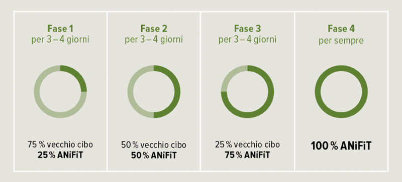 25% del cibo precedente, 75% di ANiFiT - Fase 4 (per tutta la vita dell'animale): 100% di cibo ANiFiT